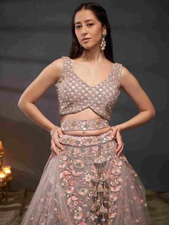 Mauve and pink embellished semi-stitched lehenga, flared hem