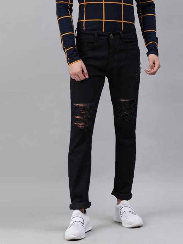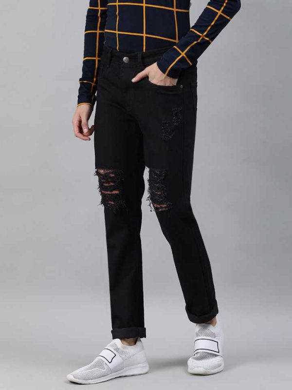Stylish & Trendy Heavy Distressed Washed Black Jeans, Cotton Lycra Fabric with Stretch (98% Cotton 2% Elastane) – To give you extra comfort and agility, Slim Fit ; Mid-Rise ; Regular Length ; Zip Fly with Buttoned Closure, Front Curved Pockets, Fashionable Ripped/Torn Design, Perfect for Casual, Party & Holiday Wear, Wash Care – Mild Wash ; Wash dark colors separately Disclaimer – There may be slight variation in shade and colour due to photographic effects and monitor settings